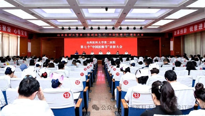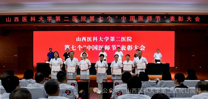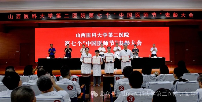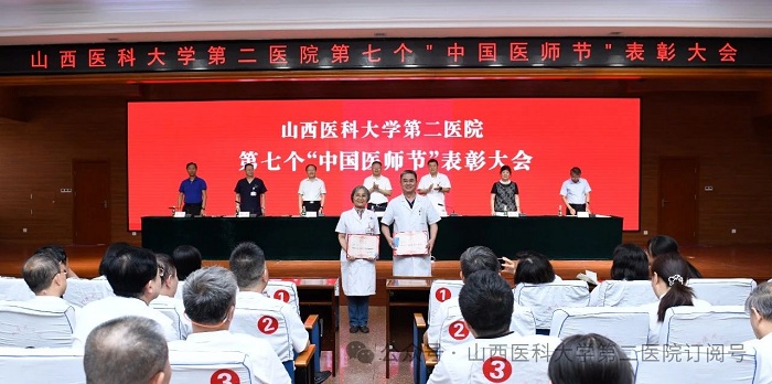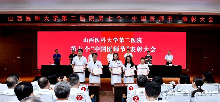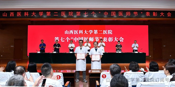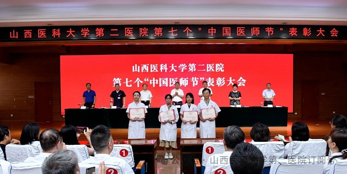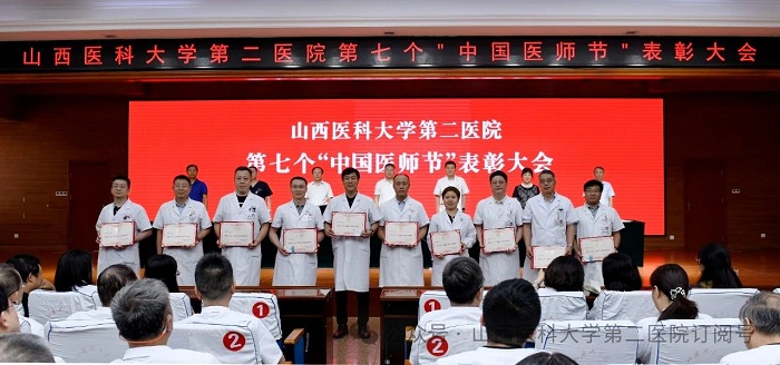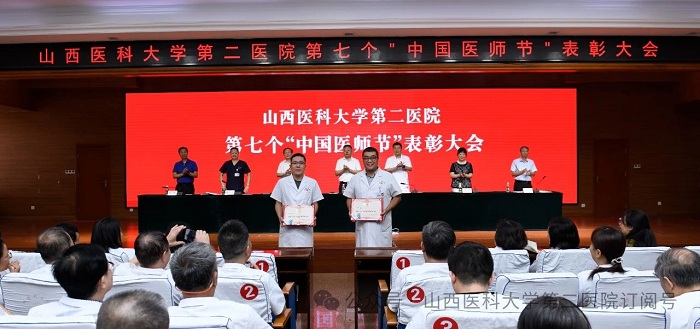 崇尚人文精神,彰顯醫者仁心。為弘揚醫者無私奉獻、救死扶傷的高尚情操,激發全院醫師的職業自豪感與使命感,8月22日下午,山西醫科大學第二醫院在影像樓六層大學術報告廳召開第七個“中國醫師節”表彰大會,對在醫院醫療工作中表現突出的醫師進行集中表彰。全體院領導出席會議,各黨支部書記、科主任、護士長和受表彰人員代表參加會議。