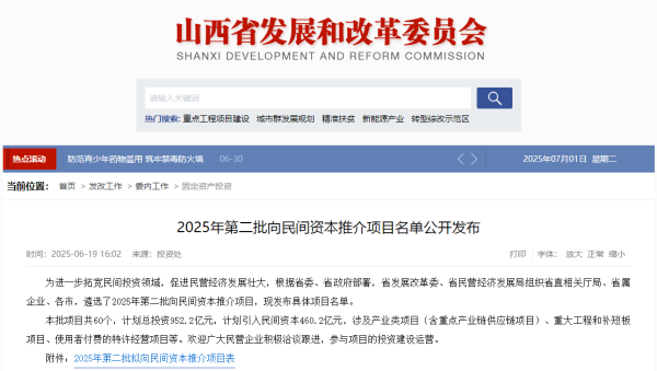 為進一步激發民間投資活力,推動民營經濟高質量發展,在省委、省政府的統籌部署下,省發展改革委、省民營經濟發展局組織省直相關廳局、省屬企業、各市,精心遴選并推出2025年第二批向民間資本推介項目。